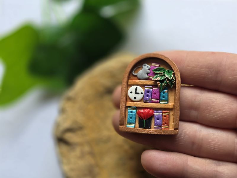 Această broșă Bibliotecă este o piesă handmade realizată din lut polimeric, inspirată de atmosfera caldă a unei biblioteci vechi. Designul detaliat include un șoricel de bibliotecă, rafturi cu cărți, un ceas decorativ și un tablou cu floare roșie, simbol al primăverii și al pasiunii pentru frumos.