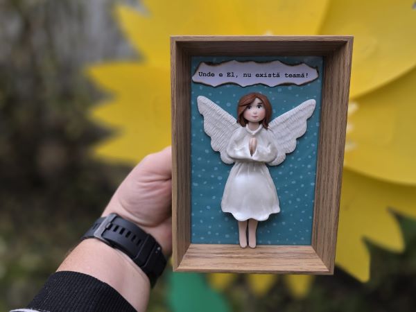 Ramă decorativă handmade, cu un îngeraș realizat manual din lut polimeric și un mesaj emoționant. Un decor delicat și plin de simbolism, perfect ca dar personalizat, cadou de botez, cadou pentru nași, aniversări sau pentru a oferi un gând frumos cuiva drag. Îngerașul din lut adaugă un farmec unic, iar textul completează perfect atmosfera caldă și protecția pe care o transmite această ramă specială.